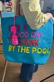 Brighten your beach days with this vibrant blue tote bag, the perfect companion for poolside relaxation. Featuring bold multicolored text that reads "It's A Good Day To Drink By The Pool," this bag makes a fun statement while you soak up the sun. Designed with practicality in mind, it includes a convenient interior zippered pocket for securing valuables, plus two additional open pockets for easy organization. The tan faux suede straps provide comfortable carrying, while a snap closure at the top keeps your essentials secure. Crafted from 100% cotton for durability and easy care, this tote measures 17" x 6.5" x 20"—spacious enough for towels, sunscreen, and all your poolside necessities. A playful pink pom tassel detail adds the perfect finishing touch.