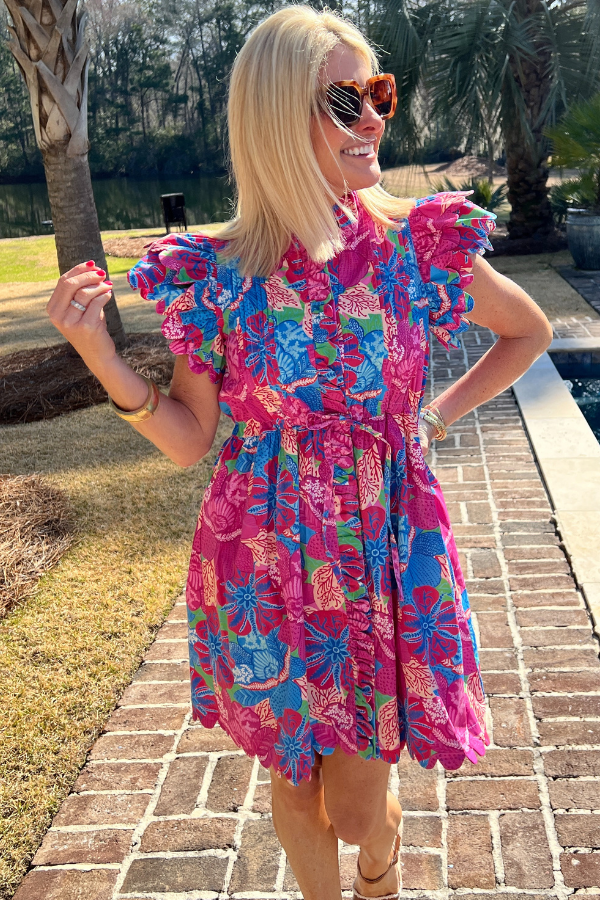 The Beau Mini features a scalloped collar, buttons from collar to hem, flutter sleeves with scalloped hem, and a drawstring waist.