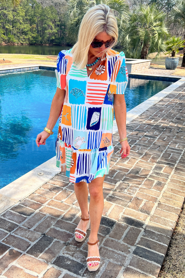 This Christian dress features a multi print design and short sleeves, making it a versatile addition to any wardrobe. Its fashionable appearance and comfortable fit make it a great choice for any occasion.