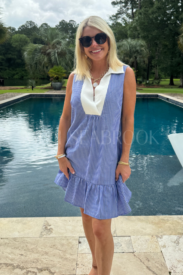 The Finn dress features a sophisticated collared design with a flattering V-neck silhouette. Its distinctive stripe pattern creates visual interest while elongating the figure. Crafted with precision tailoring, this versatile piece transitions seamlessly from professional settings to casual outings with effortless elegance.
