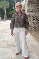 This Honeybird top features a stunning floral print and ¾ cuff bubble sleeves. The front self button closure and adjustable tie at the ruffle finish neckline add a touch of femininity. Unlined and woven, this top offers comfort and effortless style.