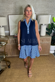 The Houston Dress is a stylish and versatile addition to any wardrobe. Crafted from a solid jersey knit with a chic stripe pattern, this sleeveless mini dress features a contrast spread collar, button closure, and skirt hem. With the added convenience of pockets and a lightweight, non-sheer lining, this dress is perfect for any occasion.