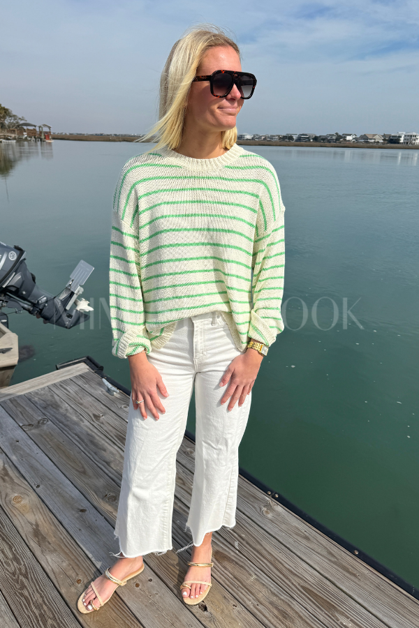 Effortlessly chic and oh-so-comfy, the Linney sweater brings a fresh vibe to your everyday rotation. This lightweight striped beauty in green and cream pairs perfectly with everything from jeans to skirts, while clever side slits add movement and a touch of modern flair. Layer it, tie it, or wear it solo—this versatile piece is ready for whatever your day throws at you.