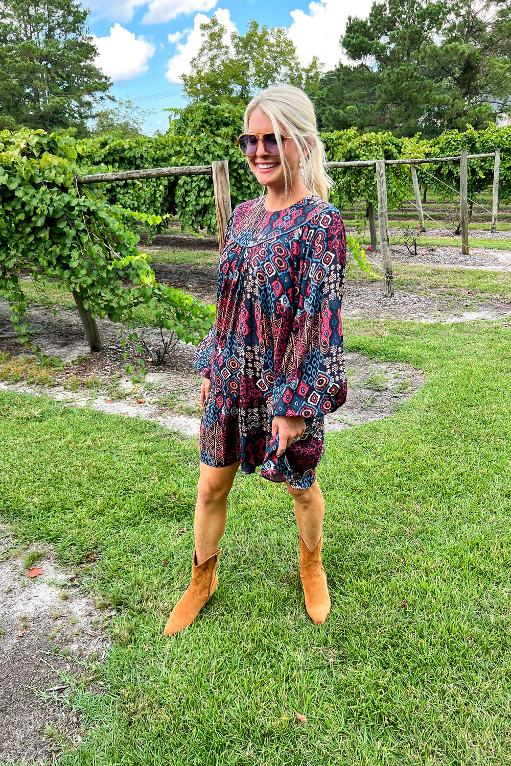 The Maria dress by King + Pitt is the perfect way to stand out. It features a stunning aztec print and a flattering loose fit that comes with long sleeves for an effortless look. With its timeless style, you'll make a lasting impression. Carrie Ann is 5’1” and wearing an XS.