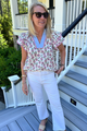 Introducing our McKellen Top, featuring a vibrant floral print and stylish flutter sleeves. The V-neck is highlighted by contrasting ruffle finish and stripe binding inset. This pullover top combines fashionable design with comfortable and flattering fit. Upgrade your wardrobe with this eye-catching piece.