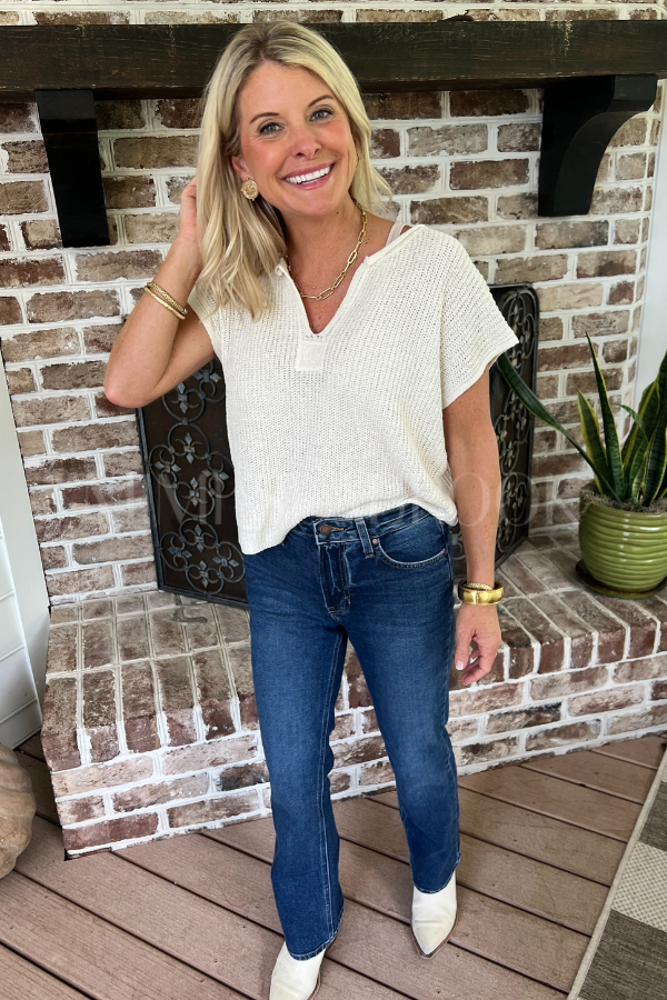 The Monique sweater features a sophisticated split neckline and short sleeves, offering a modern twist on a classic pullover design. Crafted for comfort and style, it provides a versatile layering option suitable for various occasions. Its clean lines and subtle detailing make it an essential piece for a refined wardrobe.