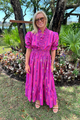 The Skyline dress in magenta multi features a stylish puff sleeve design and a smocked ruffle neck, making it a versatile and trendy option for any occasion. The midi length adds sophistication while the smocked detail offers a comfortable fit. Elevate your wardrobe with this unique dress.