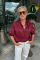 The Sonnet top features a flattering V-neck design with delicate ruffled detailing at the neck and cuffs. The balloon sleeves are both stylish and comfortable with elastic at the cuffs. The back also includes shirring for a trendy and flattering look.