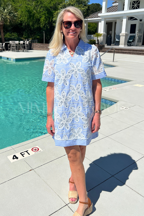The Tippi dress features a V collared neckline and short wide sleeves, creating a unique and stylish silhouette. Its floral eyelet design and striped woven fabric add a touch of elegance and sophistication.