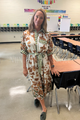 This Whitmire dress in camel showcases a botanical print on a ¾ sleeve midi silhouette. It features an abstract contrast band collar and a button-front design, complemented by a removable belt for versatile styling. Practical side pockets and a fully lined interior enhance comfort and functionality, making it a refined choice for both casual and polished occasions.