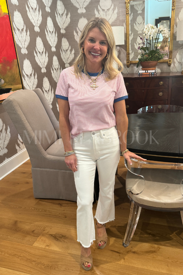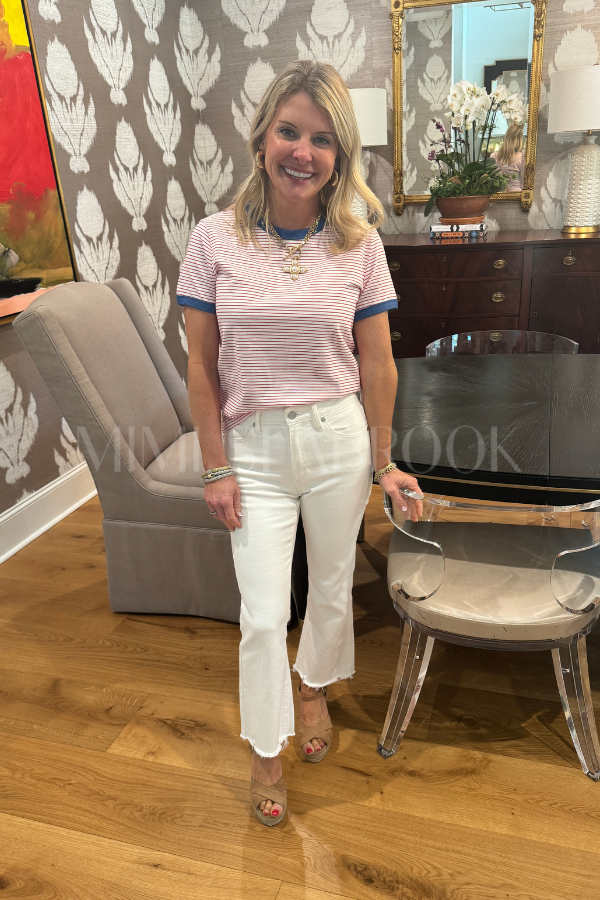 This contrast striped knit tee embodies understated sophistication with its crisp white and red striping. The refined construction and quality knit fabric create a piece that works as a standalone statement or layered beneath blazers and cardigans.