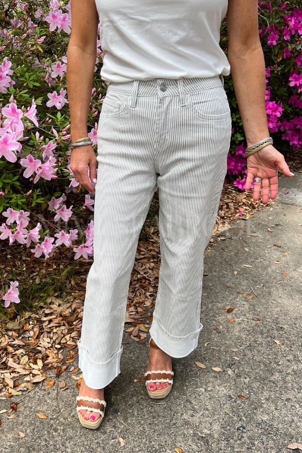 Elevate your denim game with the Haile high rise jeans—a modern take on a classic silhouette. Featuring a high-rise waist that flatters and elongates, these wide-leg jeans offer comfort stretch fabric for all-day wearability. The striped print adds visual interest, while the cropped length keeps the look contemporary and versatile. Five functional pockets and a fixed bar tack single cuff hem ensure durability and style.