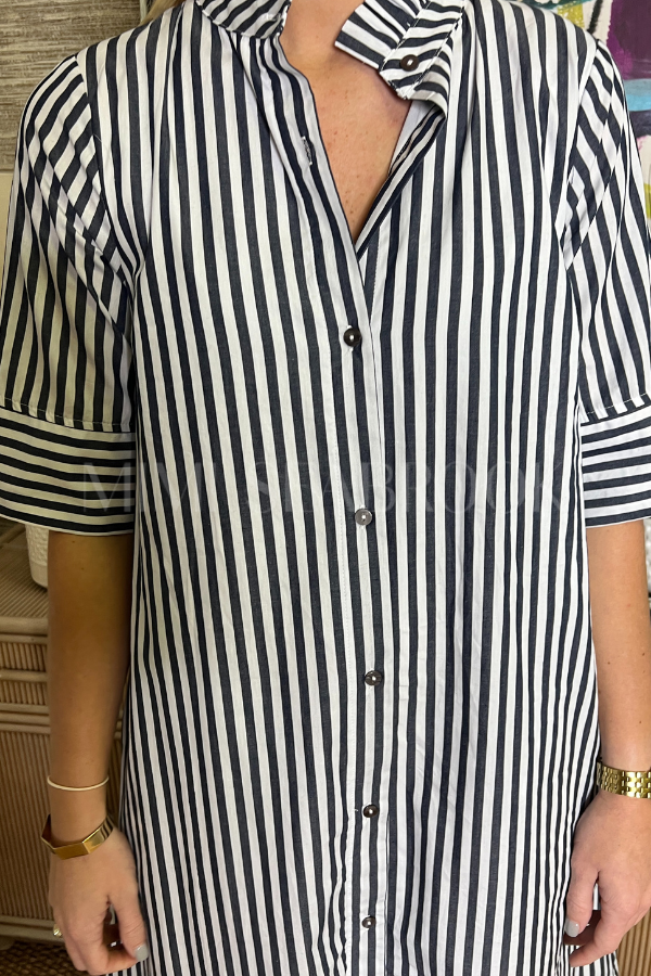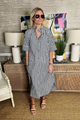 The Carolyn dress brings effortless charm. Featuring classic stripes, a polished collar, and convenient button-front closure, this dress transitions seamlessly from casual weekends to put-together weekday moments. The timeless design pairs beautifully with sneakers or sandals, making it a versatile wardrobe essential that works as hard as you do—minus the stress.