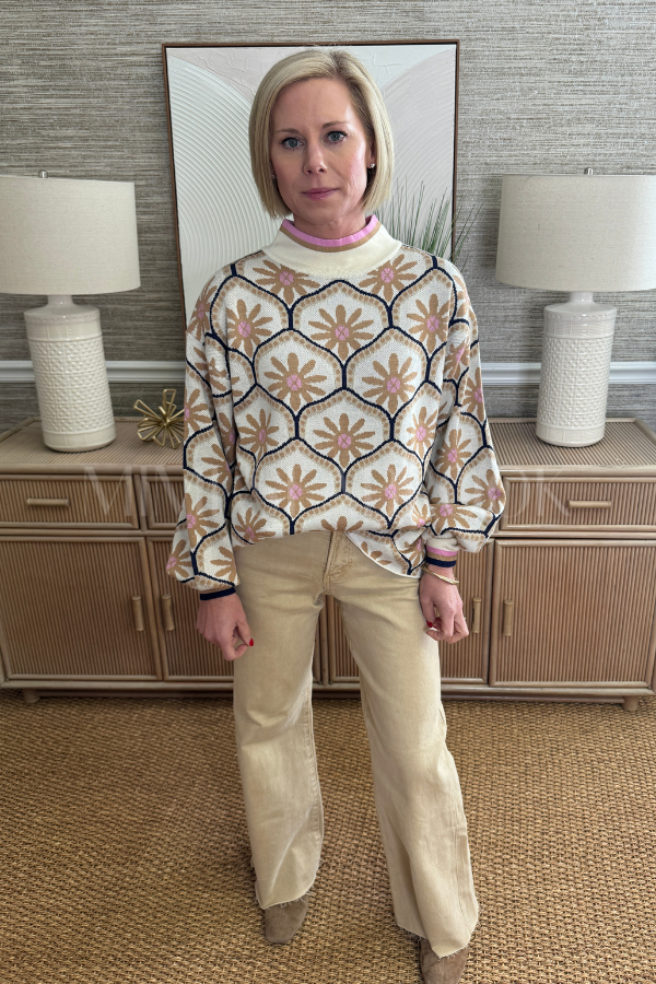 The Rebecca sweater brings geometric flair to your everyday rotation with its eye-catching floral motif and cozy mock neck design. Perfect for layering or wearing solo, this piece strikes the ideal balance between artistic pattern and wearable comfort.