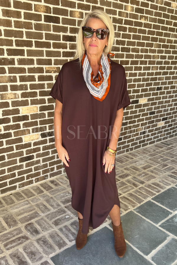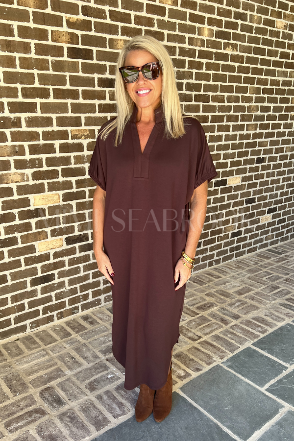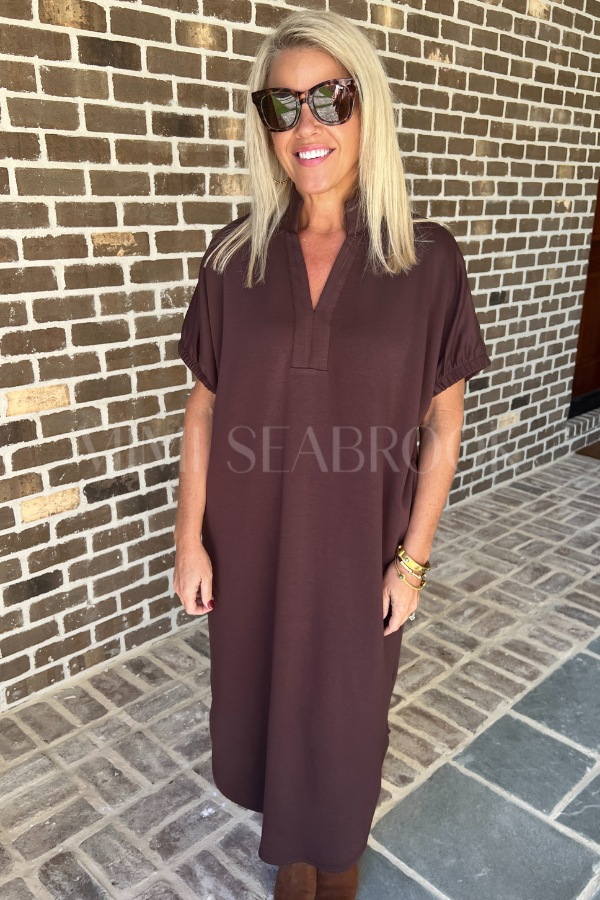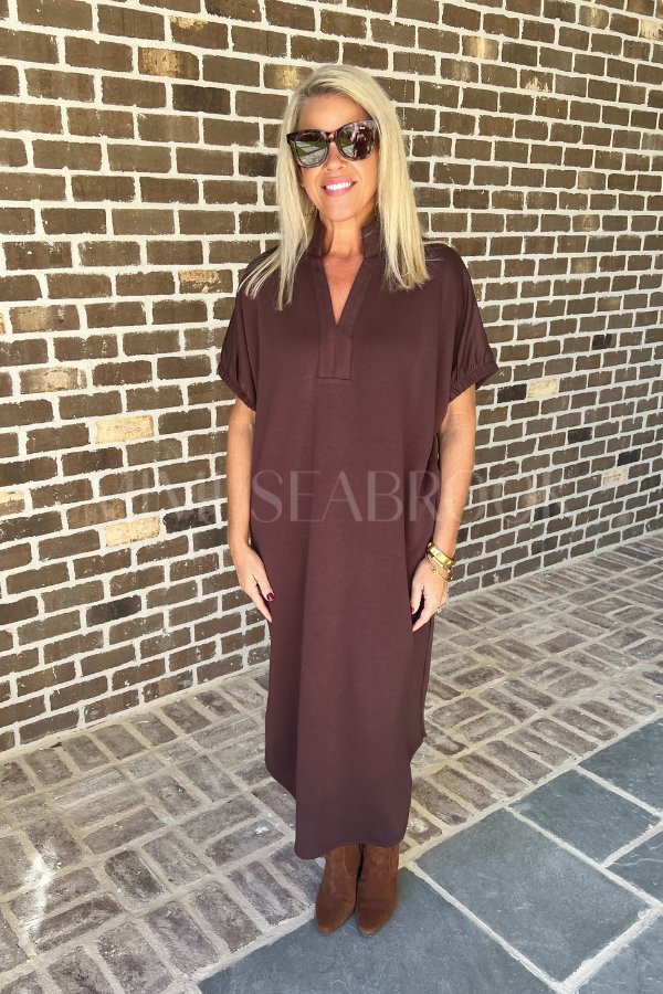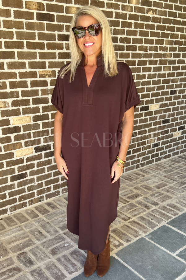 This playful Lara dress in espresso combines comfort with a touch of charm. Its short sleeves end in elasticated openings for a snug but relaxed fit, while a band collar and V-neck add a stylish twist. Perfectly practical, it features handy side pockets to keep your essentials close.