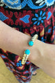This Bonnie cuff bracelet features a stunning combination of gold and turquoise, creating a sleek and elegant design. Its lightweight design ensures comfortable wear, making it a perfect accessory for any occasion. Elevate your style with this eye-catching piece.