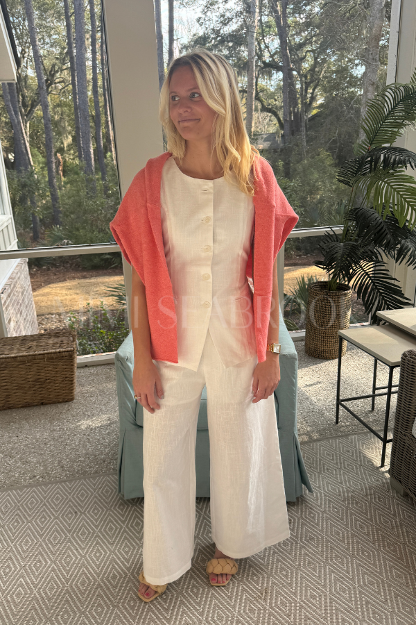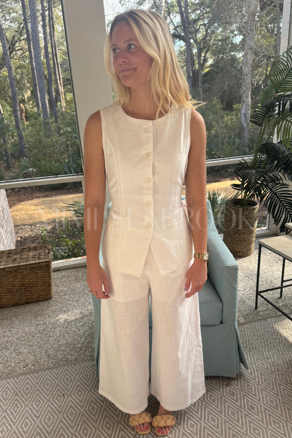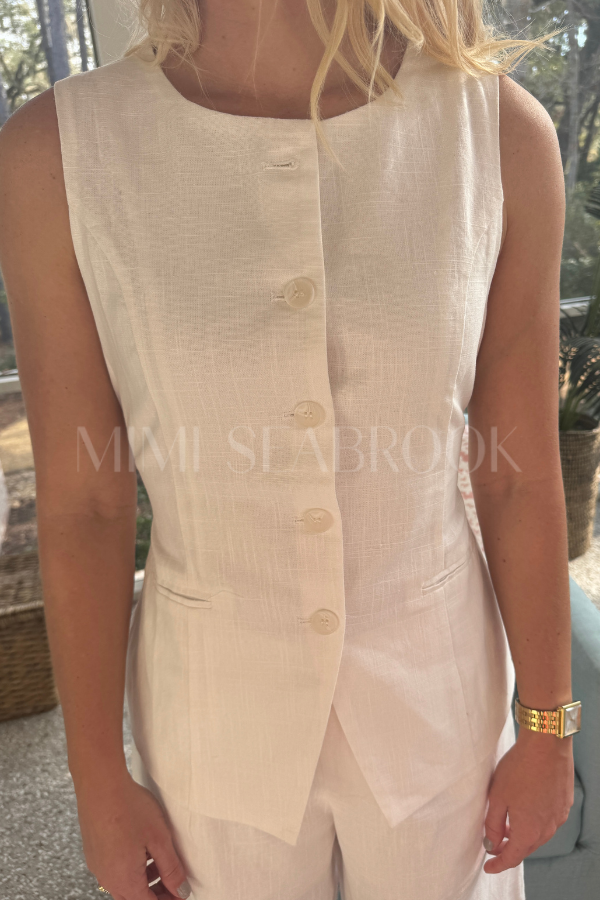 Effortless elegance meets laid-back vibes with this crisp white button-down sleeveless top. Perfect for layering over your favorite tee or going solo on warm days, the Baroody top brings a touch of preppy charm to any outfit. Classic white never goes out of style—dress it up with tailored trousers or keep it casual with denim.