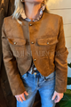 The Dillard jacket combines understated elegance with versatile styling. Crafted in luxurious suede with a soft yet structured silhouette, this piece features a modern collarless round neckline and curved hem detail that flatters any frame. Functional front flap pockets with polished snap buttons add refined touches, while the streamlined design transitions effortlessly from casual to dressed-up looks.