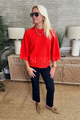 Cozy up in the Fresno sweater in red, designed with a relaxed drop shoulder and wide sleeves for extra comfort and style. Its soft fabric makes it perfect for lazy days or casual outings where comfort meets playful charm.