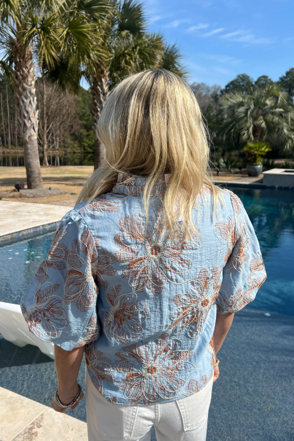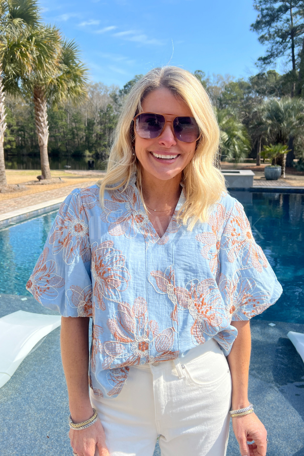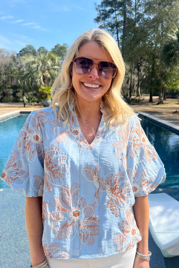 The Glenfield top effortlessly combines elegance with comfort through its thoughtfully designed silhouette. Delicate embroidered florals create visual interest across the lightweight fabric, while the ruffled split neckline adds a refined touch of femininity. Soft puff sleeves frame the shoulders with understated charm, and the relaxed fit ensures all-day wearability without compromising on style.