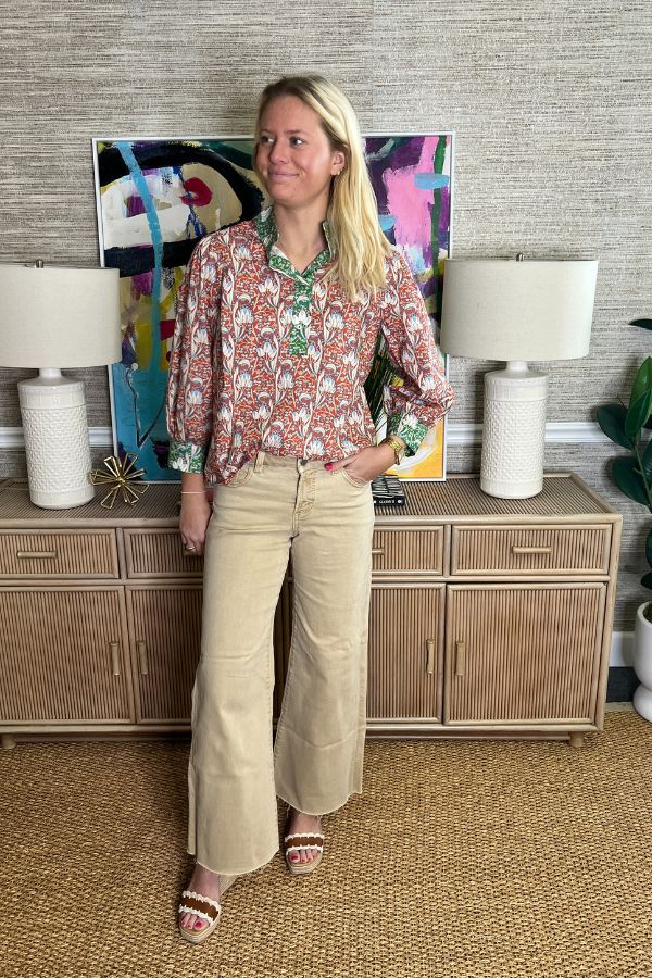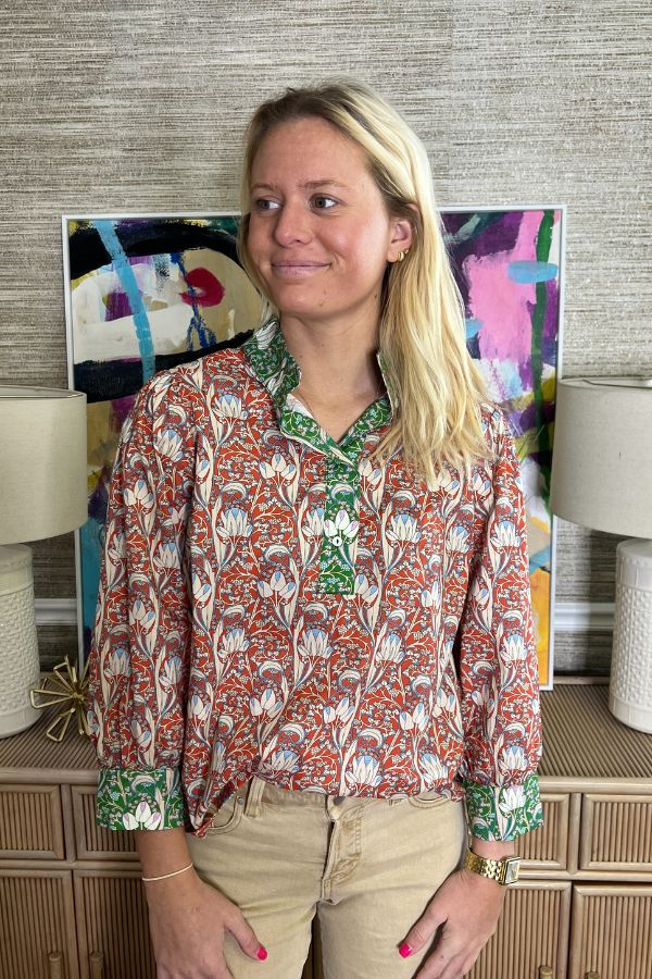 The Lyon top effortlessly blends refined style with modern versatility. This sophisticated piece features a striking color block floral design in mixed woven fabrics, creating visual interest with every wear. The wide contrast print banded neckline frames the face beautifully, while three-quarter length sleeves with contrast cuffs add polished detail. A quarter button-down closure provides easy layering and adjustable styling options.