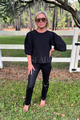 The Rina top features a round neckline and voluminous paneled design that adds dimension and elegance. Its three-quarter sleeves offer a balanced silhouette, making it a versatile choice for both professional and casual settings.