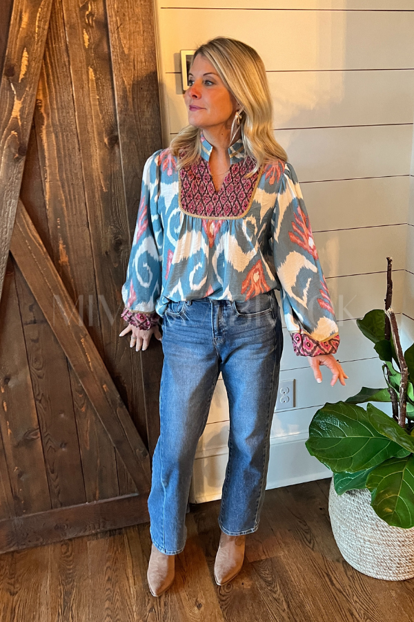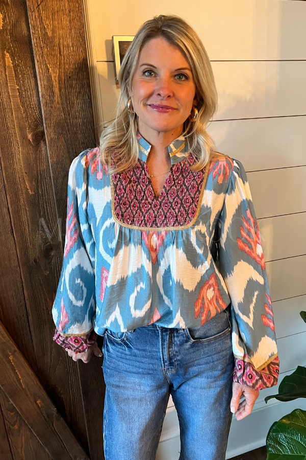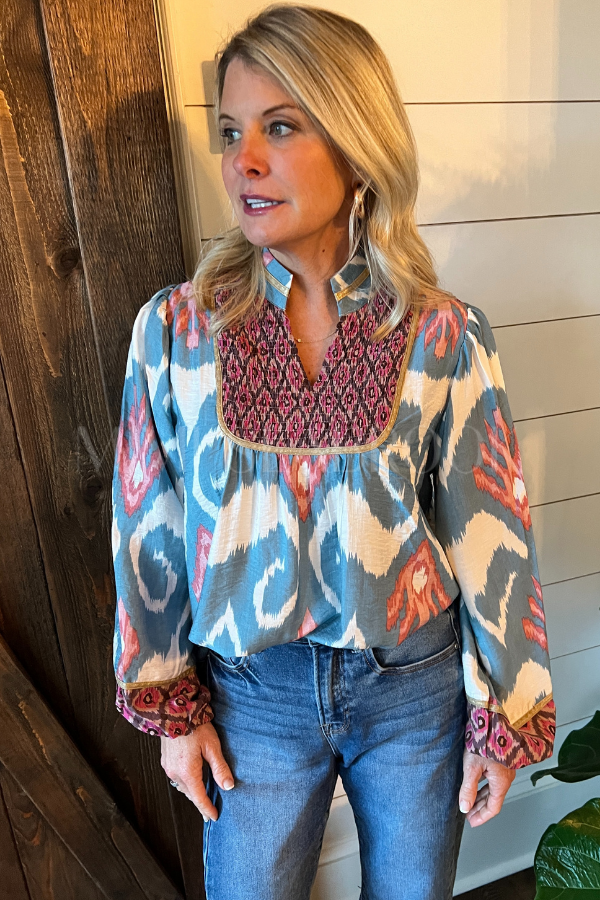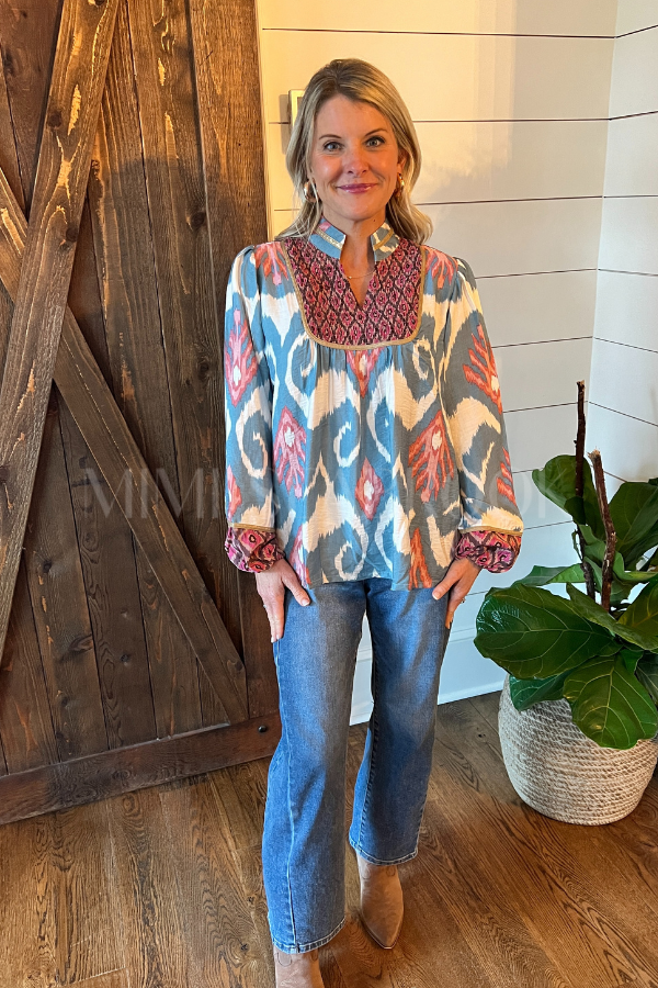 Embrace your free-spirited side with this stunning Roman top, featuring a vibrant ikat print that brings bohemian flair to any outfit. The intricate geometric patterns and rich colors make it perfect for layering or wearing solo. Lightweight and breathable, this boho blouse transitions effortlessly from casual days to evening adventures.