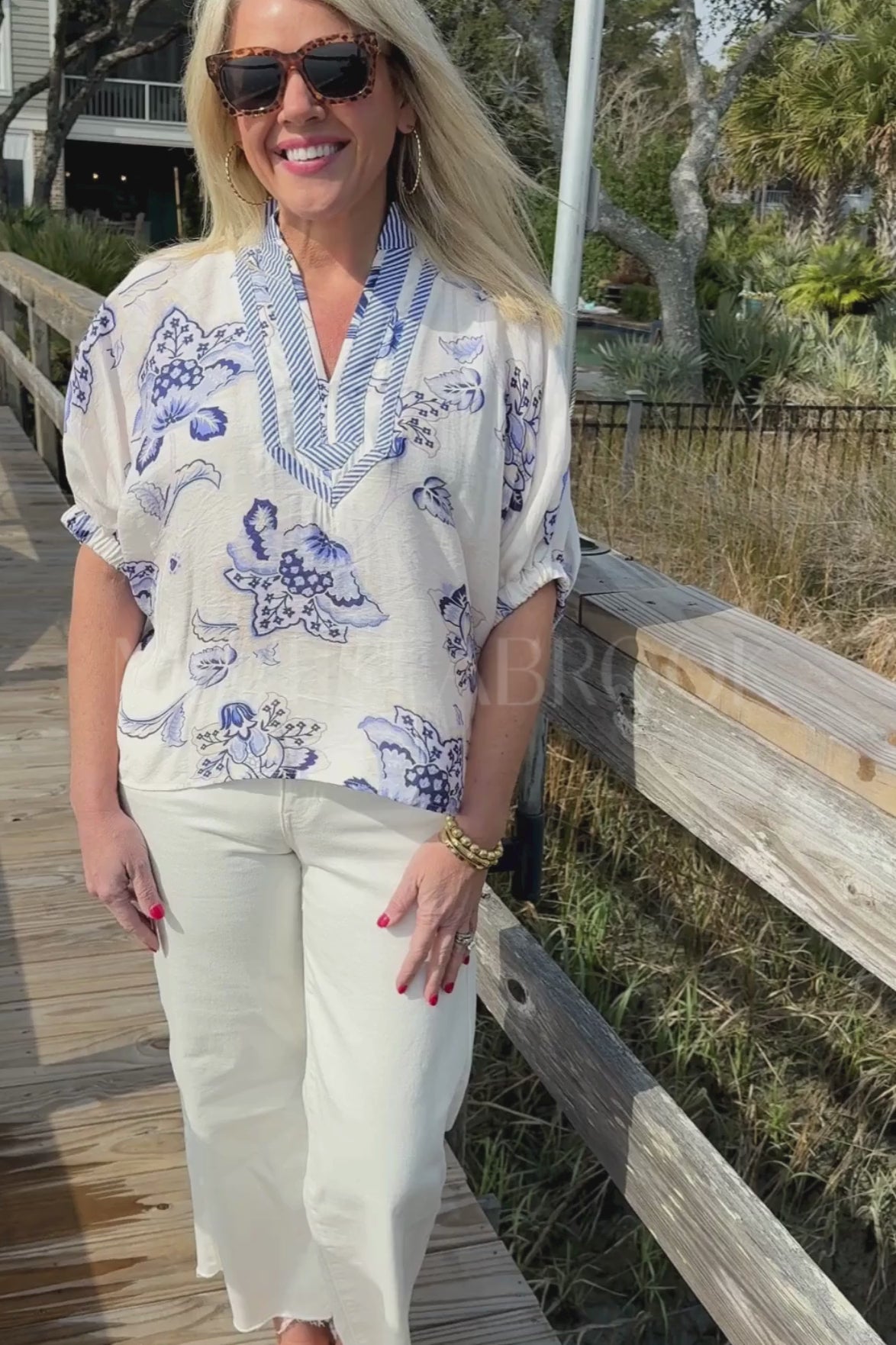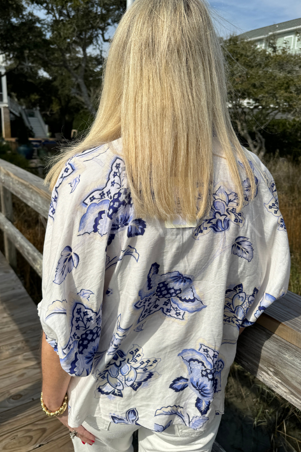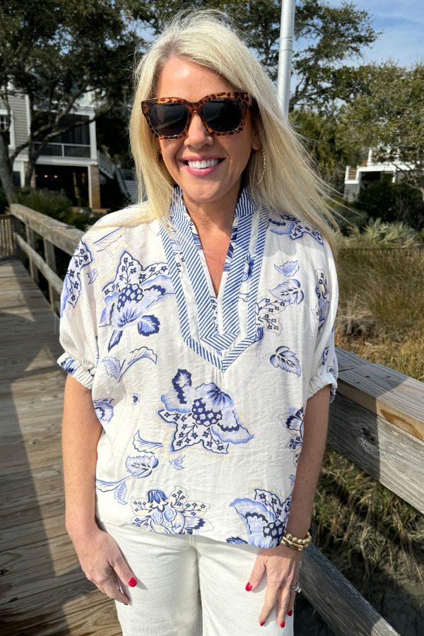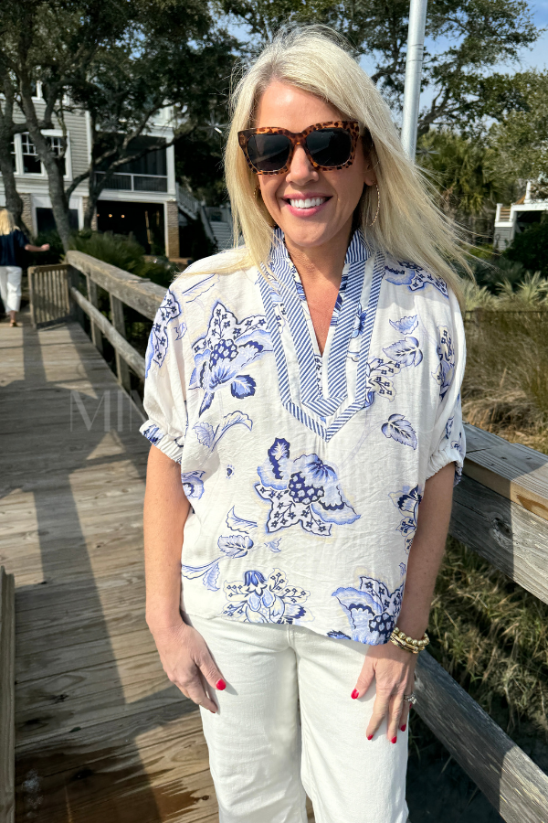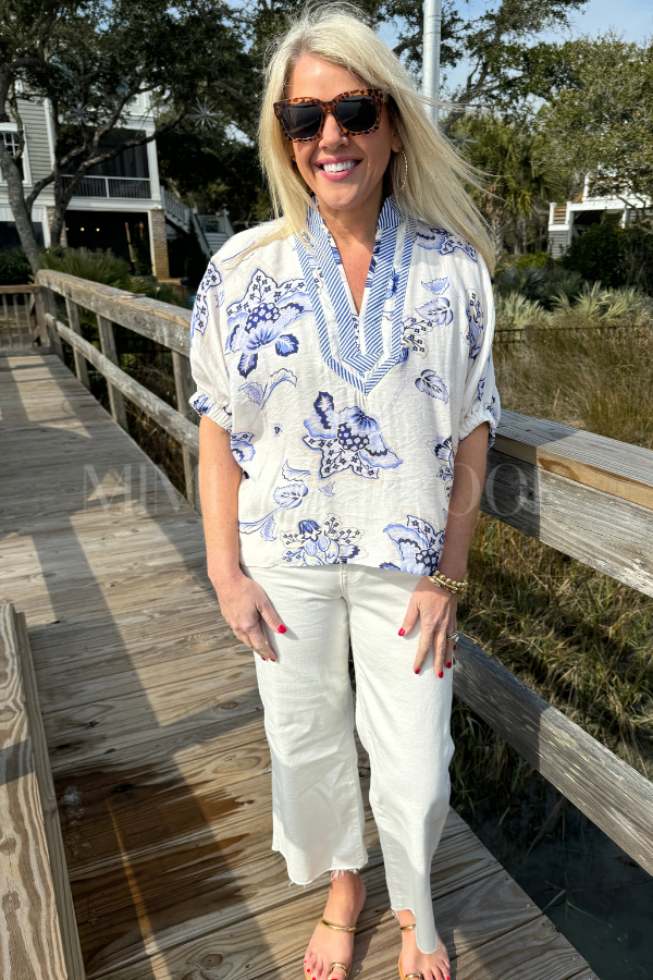 Meet the Spruce top—your new go-to for laid-back style with a splash of personality. This lightweight woven piece showcases a cheerful floral print that pairs beautifully with a striped band collar and V-neckline for added visual interest. The relaxed dolman sleeves keep things comfy and cool, while elasticated cuffs add a polished finishing touch.