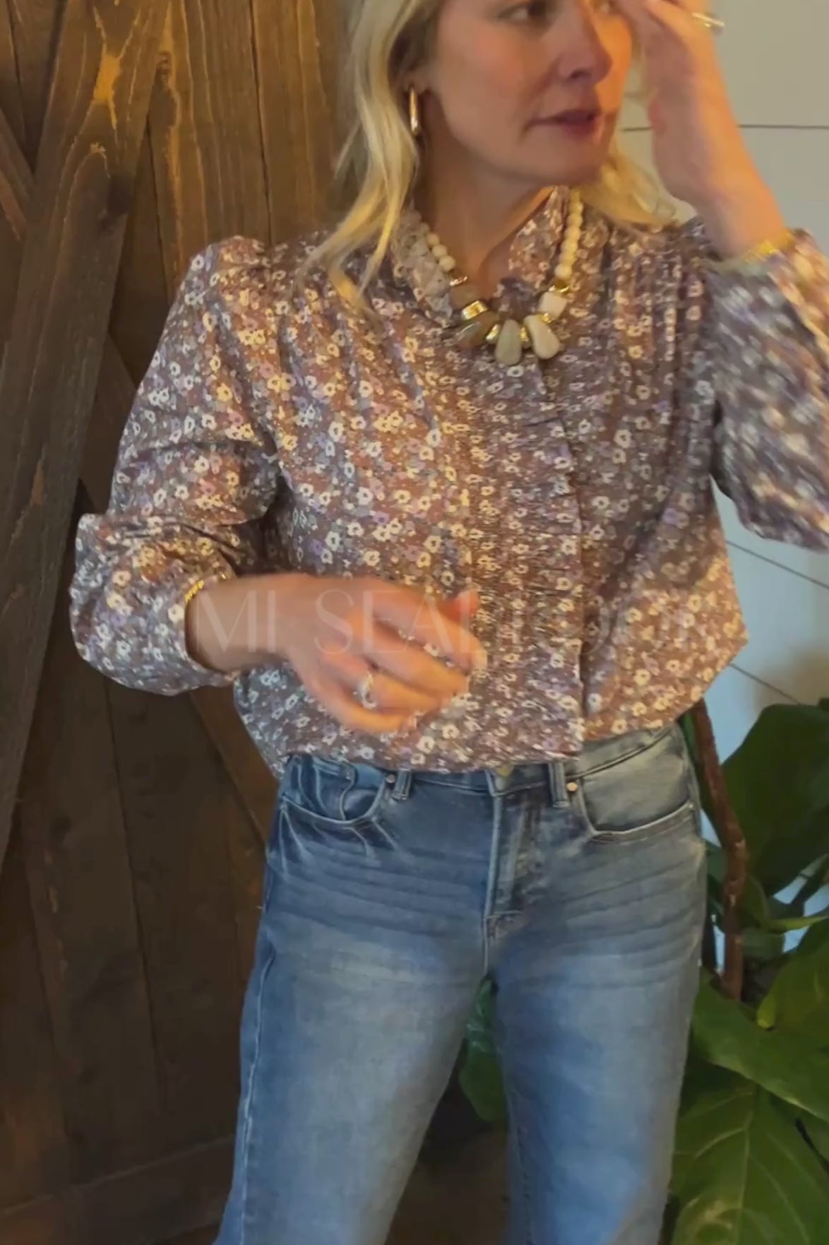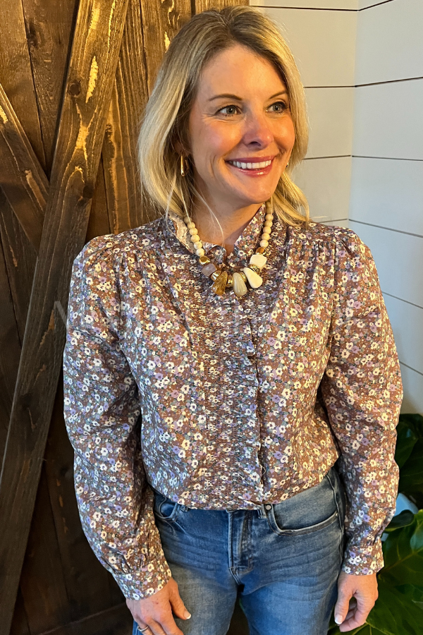 Make a statement with the Wyndham top, a stunning ruffled neck floral button down blouse designed to turn heads. The romantic ruffled collar frames your face beautifully while the eye-catching floral pattern adds dimension and charm to your look.