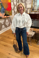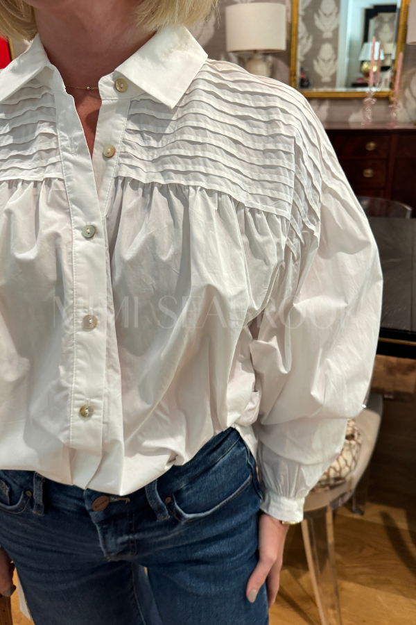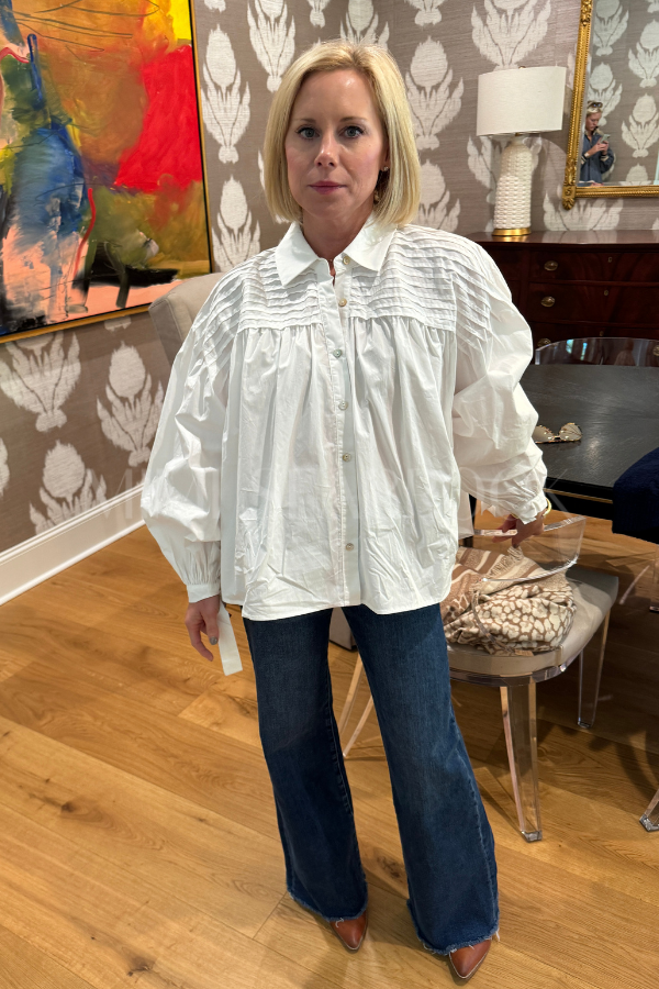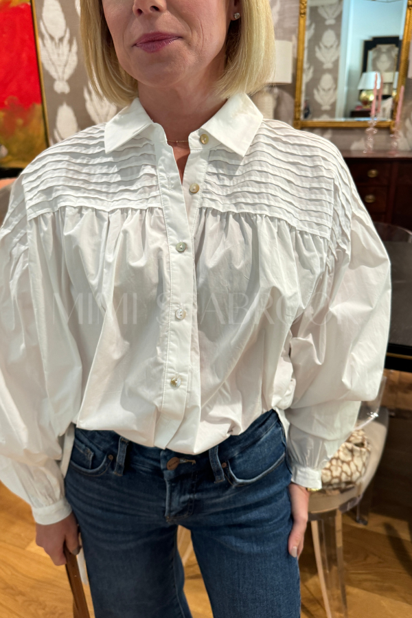 The Yana Top combines a classic button-down style with a playful twist. Its basic collar and shirring detail offer a flattering fit, while balloon sleeves with tie cuffs add a fun, whimsical touch. Made from 100% cotton, it’s soft, breathable, and perfect for effortless everyday flair.