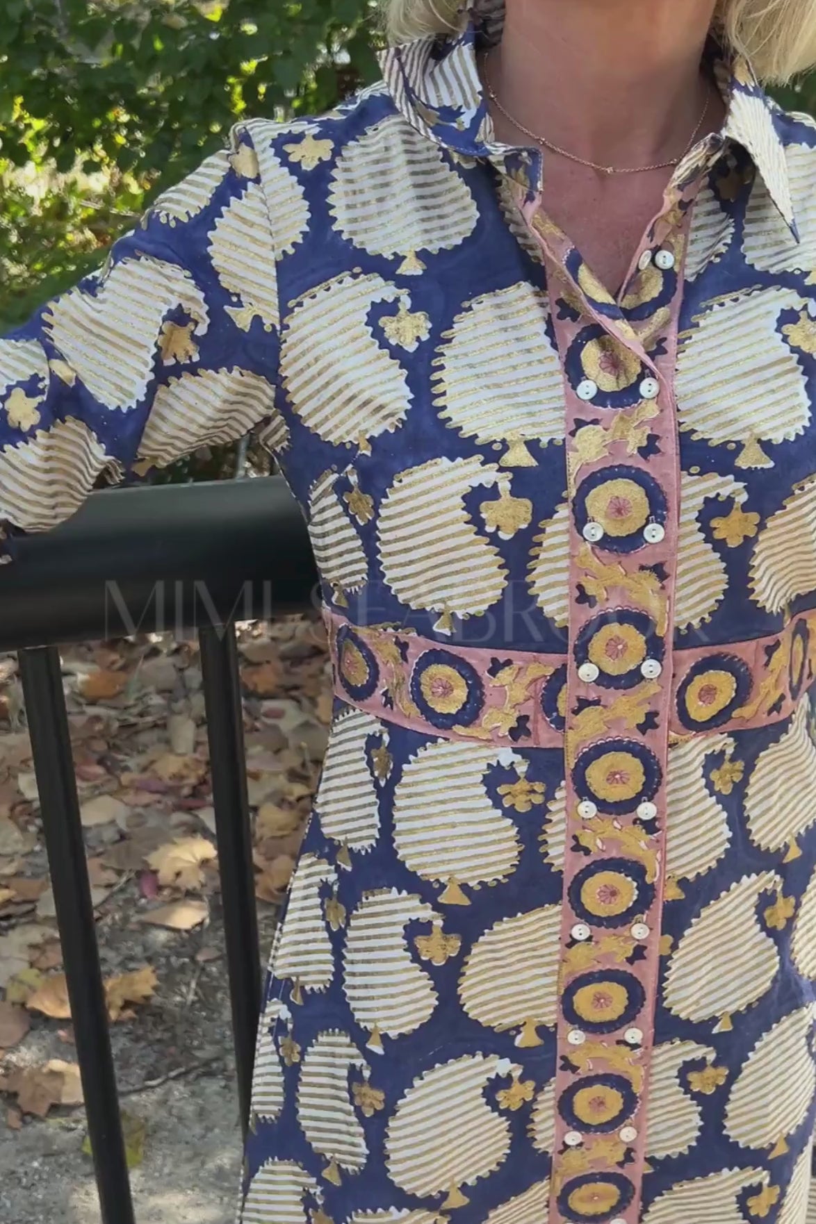 Oliphant's iconic shirt dress gets a refresh in a transitional print perfect for the changing of the seasons. This beautiful design showcases a gorgeous print with golden accents all hand-printed on structured cotton.
