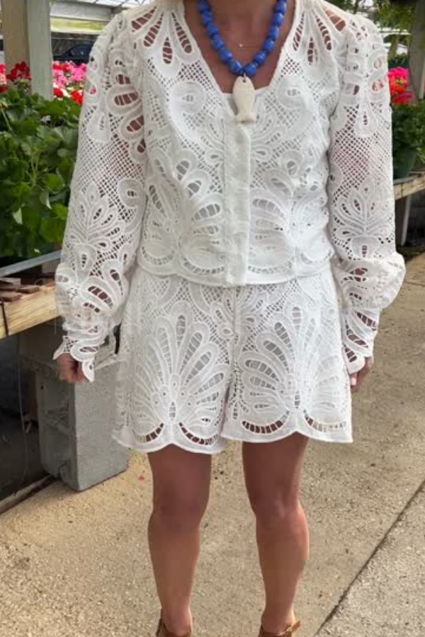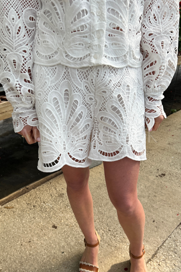 Ferguson shorts combine timeless elegance with modern comfort. These high-waisted styles feature intricate embroidered lace with delicate openwork detailing, creating a refined aesthetic. The scalloped hem adds a graceful finishing touch, while the fully lined construction ensures both coverage and ease of movement.