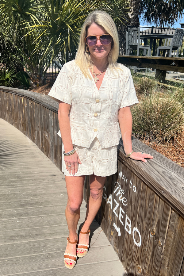 Westbury shorts bring effortless charm to your warm-weather wardrobe. Crafted from soft cotton with an eye-catching geometric eyelet pattern, these tailored shorts blend classic style with artisanal flair. The flat front waistband pairs with elastic back for a comfortable fit, while thoughtful details—side pockets, welt back pockets, a front pleat, and an intricate flower button closure—add personality. Full lining keeps you covered, and belt loops let you customize your look.