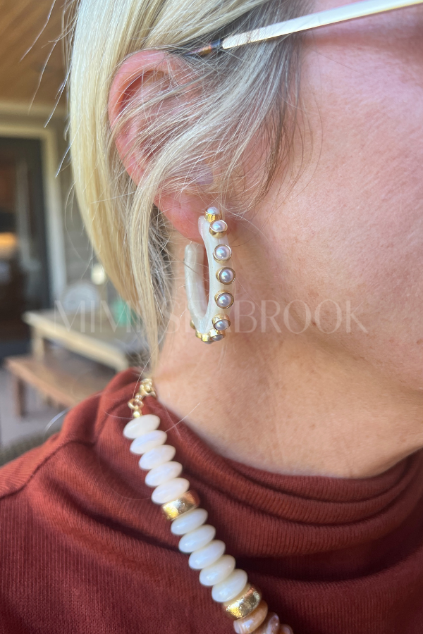The Janet Hoop Earrings mix playful acetate with shimmering pearls and opal accents for a fresh, fun look. These lightweight hoops add a splash of color and sparkle, perfect for brightening up any outfit with a touch of whimsical charm.