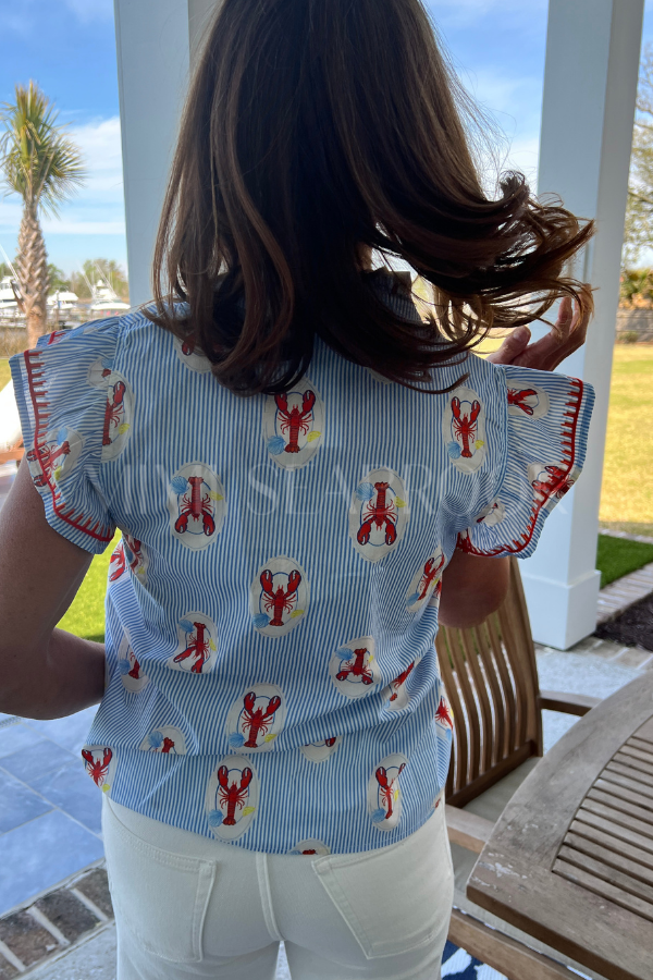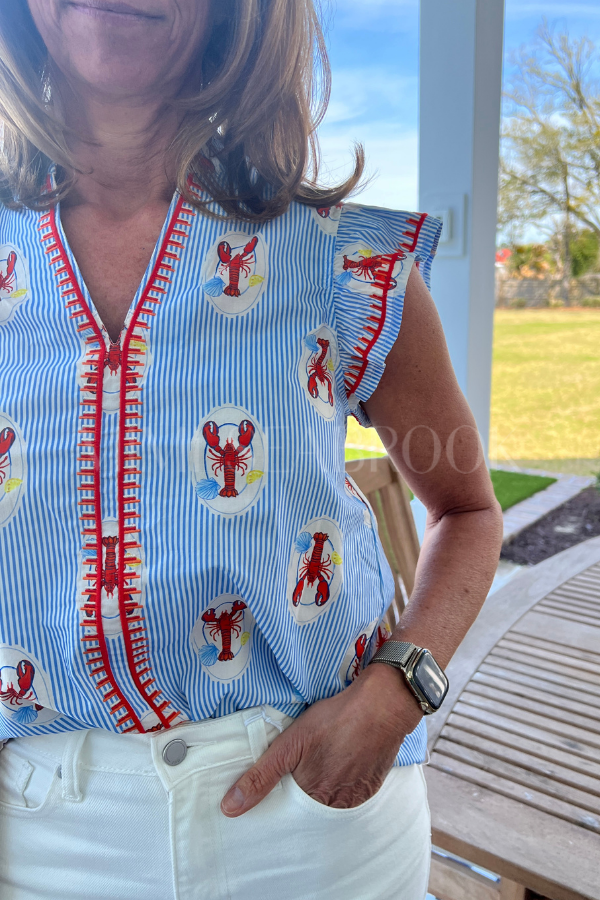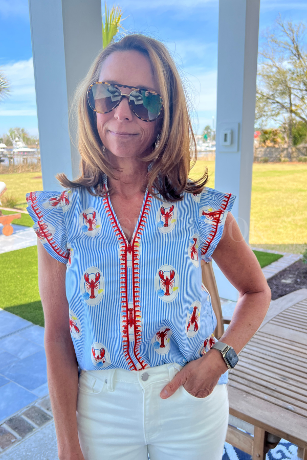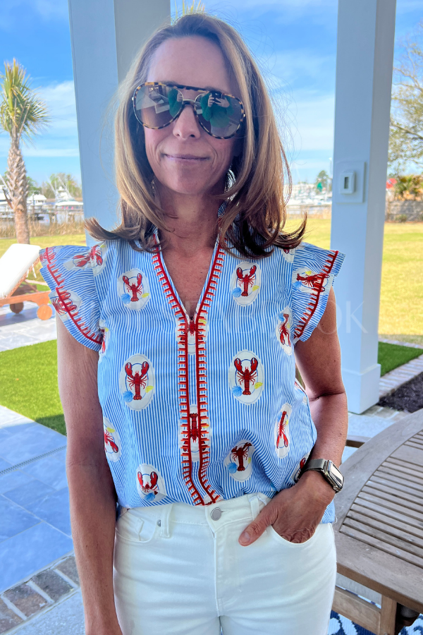 Discover the charm of coastal living with our Brine top, showcasing a vibrant lobster print paired with elegant embroidered embellishments. This distinctive piece captures the essence of seaside sophistication, transforming your everyday wardrobe into something truly memorable. The thoughtfully designed print and detailed needlework create visual interest that draws compliments, while the quality construction ensures lasting wear.