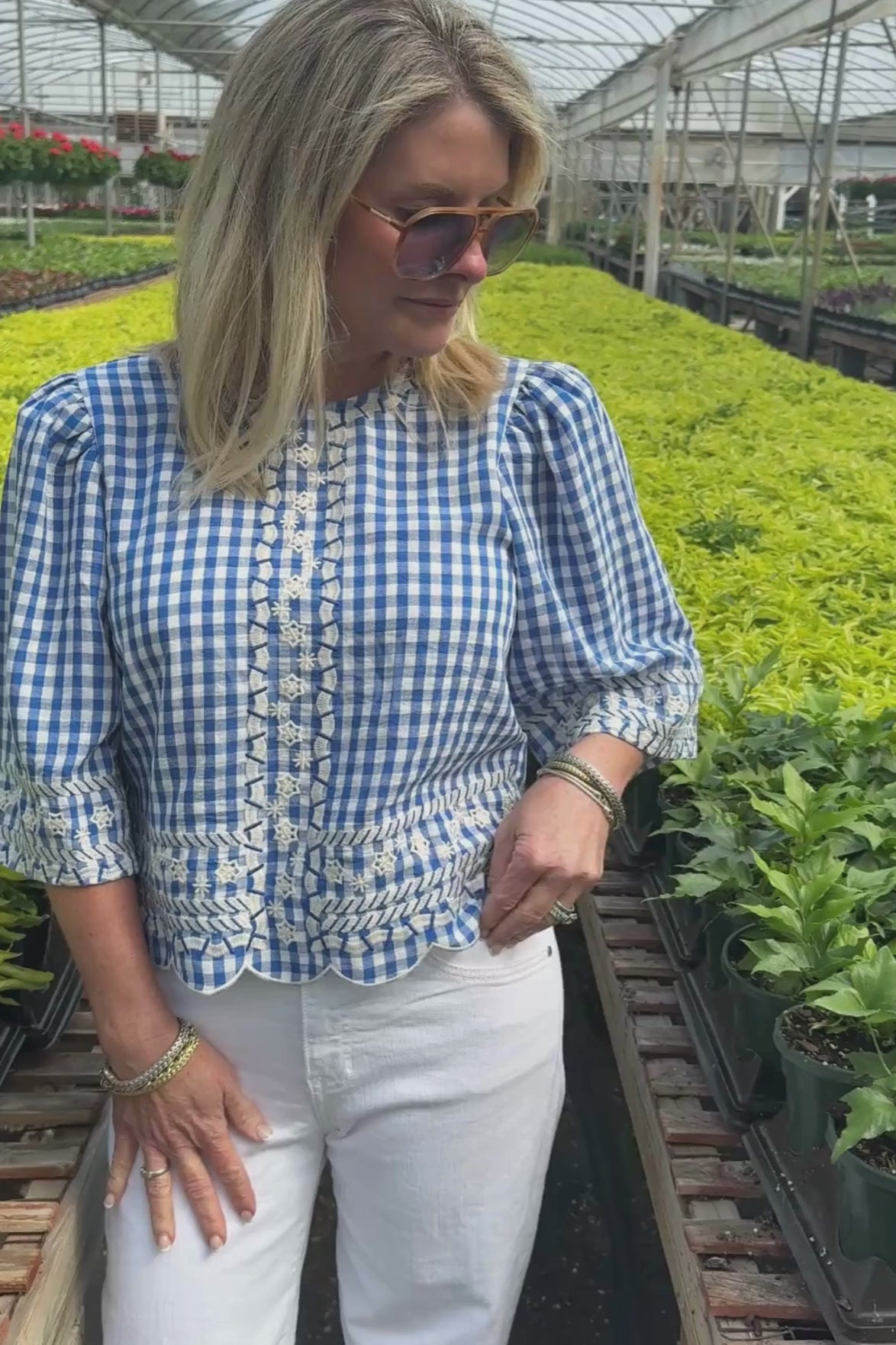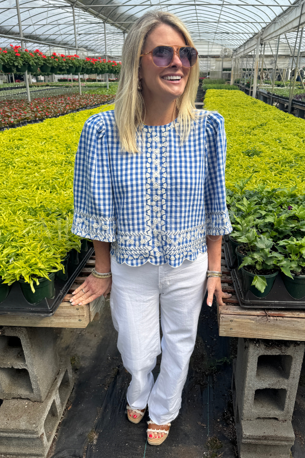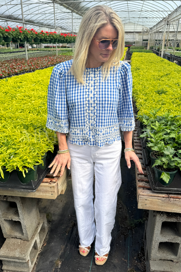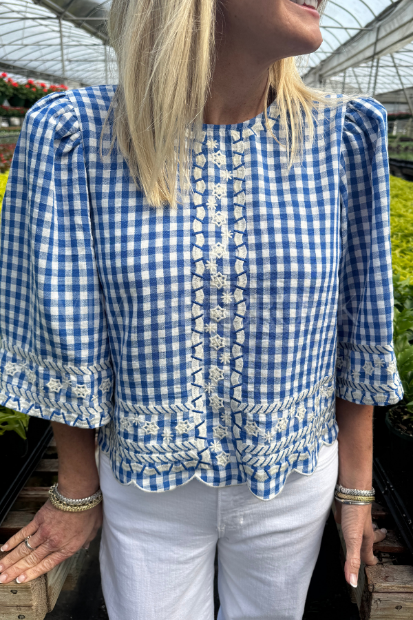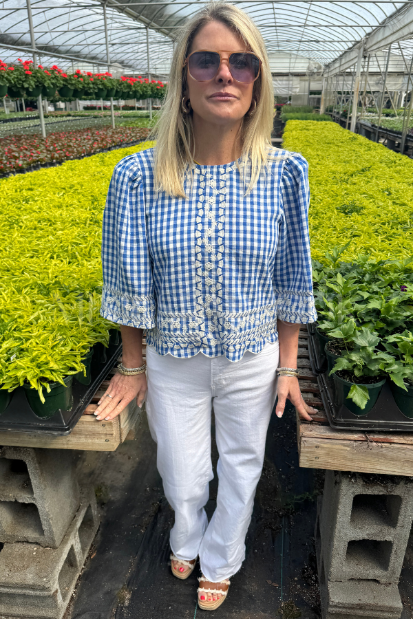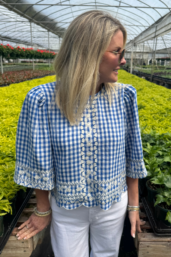 The Chelton top brings effortless charm to your everyday wardrobe. This short sleeve gingham piece features delicate embroidery detailing that adds a touch of sophistication without sacrificing comfort. Perfect for layering or wearing solo, it transitions seamlessly from casual weekends to polished weekday looks. The classic gingham pattern pairs beautifully with your favorite denim or skirts, making it a versatile staple you'll reach for again and again.