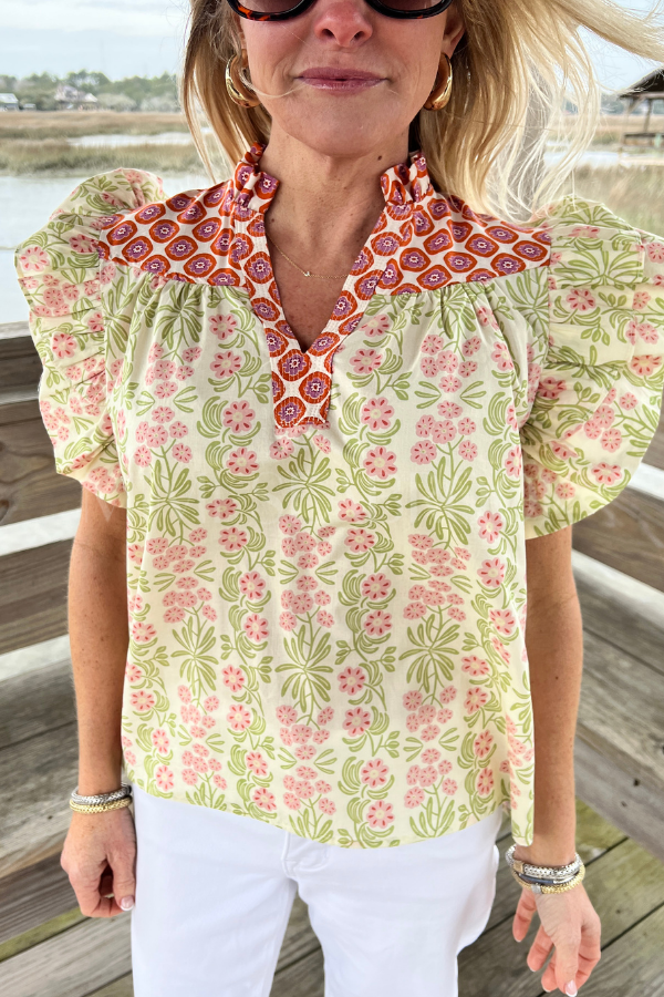 The Mary Martin top is the wardrobe essential you've been waiting for. Its flattering v-neckline and eye-catching floral pattern instantly elevate any outfit, while the delicate ruffled sleeves add just the right amount of feminine flair. Versatile enough for work, weekend adventures, or special occasions, this top works harder than you'd expect.