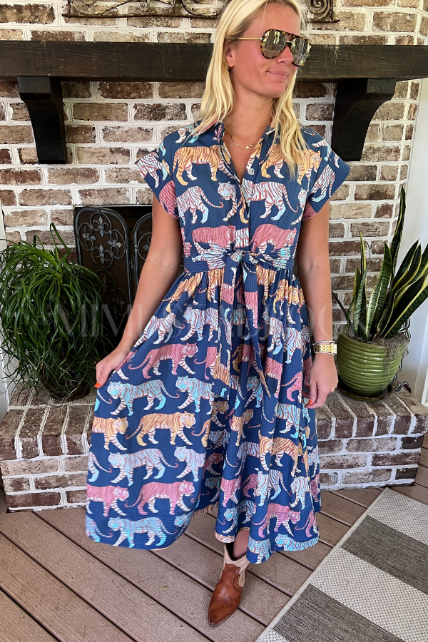 Add a splash of fun to your wardrobe with this playful belted shirt dress in Raj Navy. Crafted from slightly structured cotton poplin, it features an all-over pattern that keeps things lively. The shirt dress bodice pairs perfectly with a twirling midi circle skirt, while hidden Mother of Pearl buttons and double topstitching bring subtle charm. Tied together with a matching belt and practical side seam pockets, this dress is as delightful as it is functional.