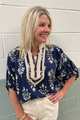 The Kendra top showcases an abstract botanical print with short dolman sleeves, offering a relaxed yet refined silhouette. Its caftan-inspired V-neck band with contrast accents adds a sophisticated focal point, enhancing both style and comfort.
