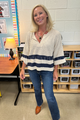The Sabine sweater offers a relaxed, loose fit with a slouchy cropped silhouette, perfect for layering or casual wear. Its striped design adds a subtle yet stylish pattern, making it a versatile piece that combines comfort with contemporary fashion.