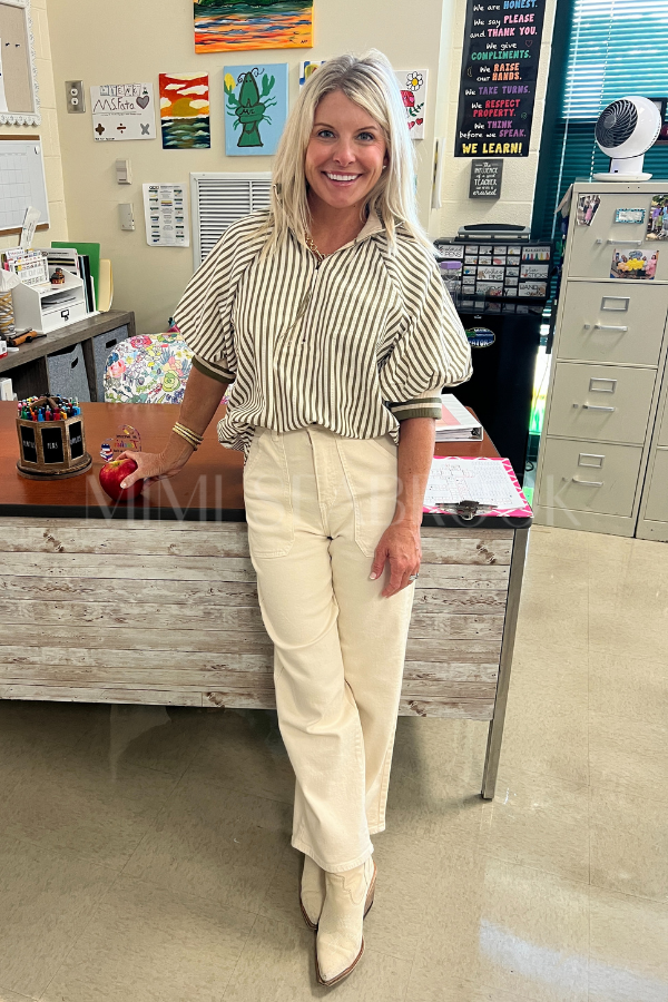 This Tadley top features a distinctive stripe pattern and a convenient half-zip closure, combining style with functionality. Its short puff sleeves add a subtle volume, while the multicolor accent band provides a refined contrast, enhancing the overall design.