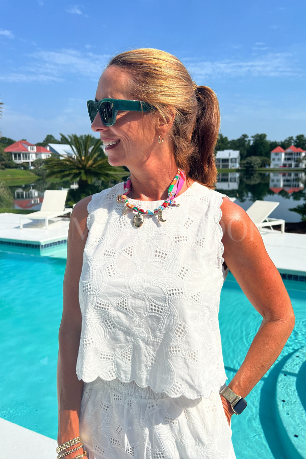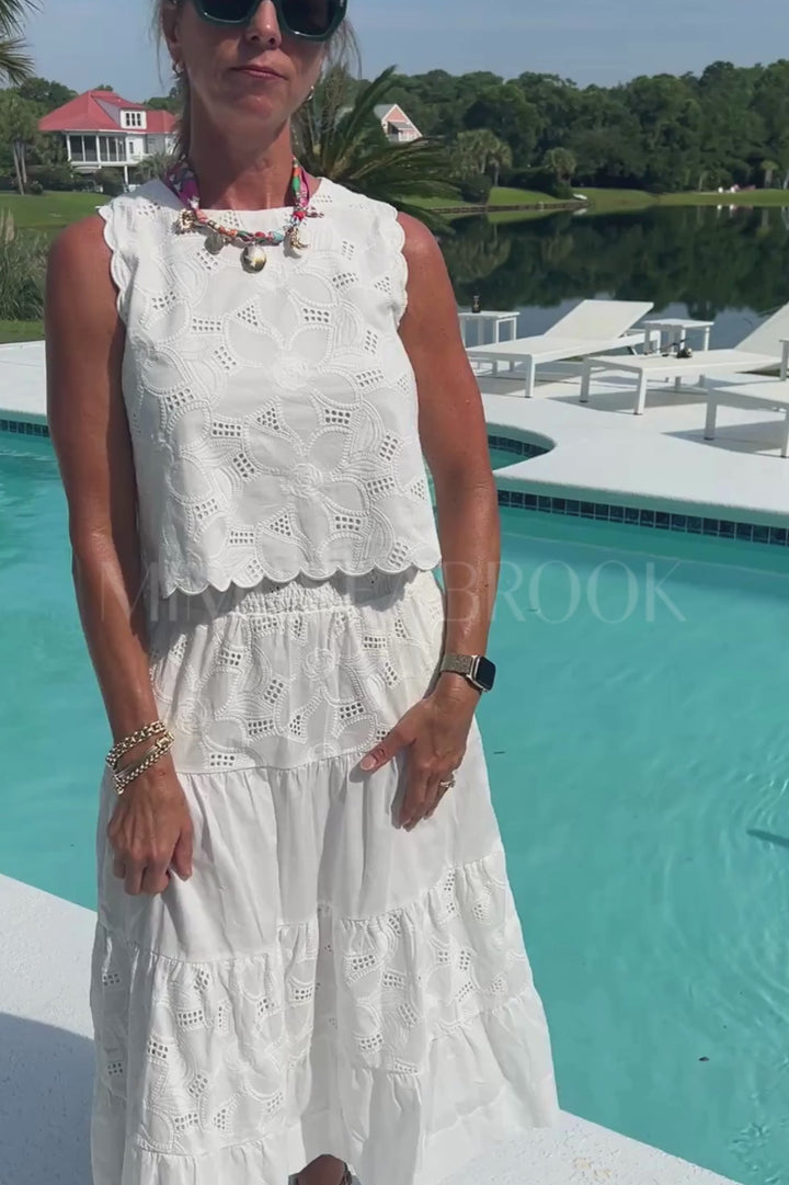 Crafted from breathable cotton, the Adams top features delicate eyelet fabric with a scalloped edge for refined detail. This design offers both comfort and a sophisticated touch, making it an ideal choice for warm-weather layering or standalone wear.