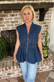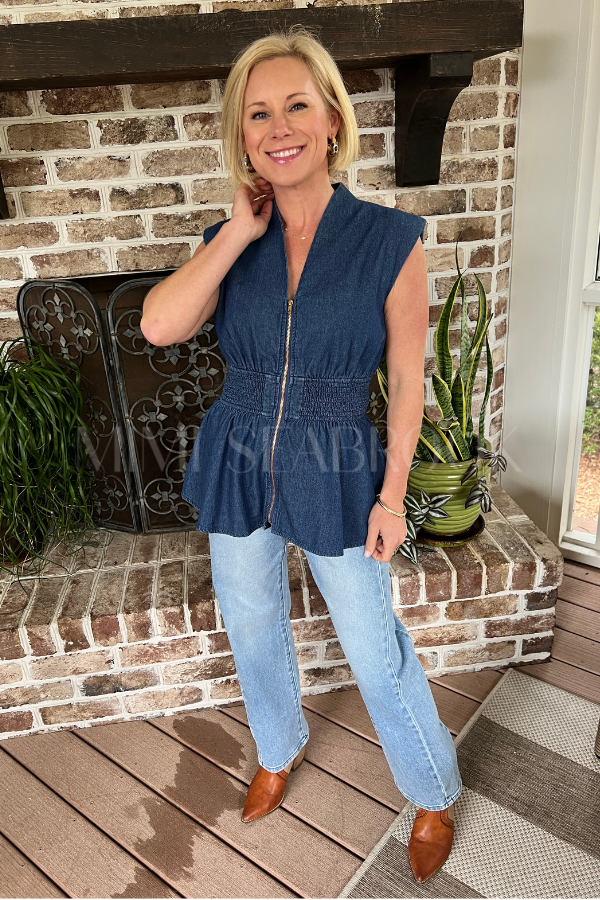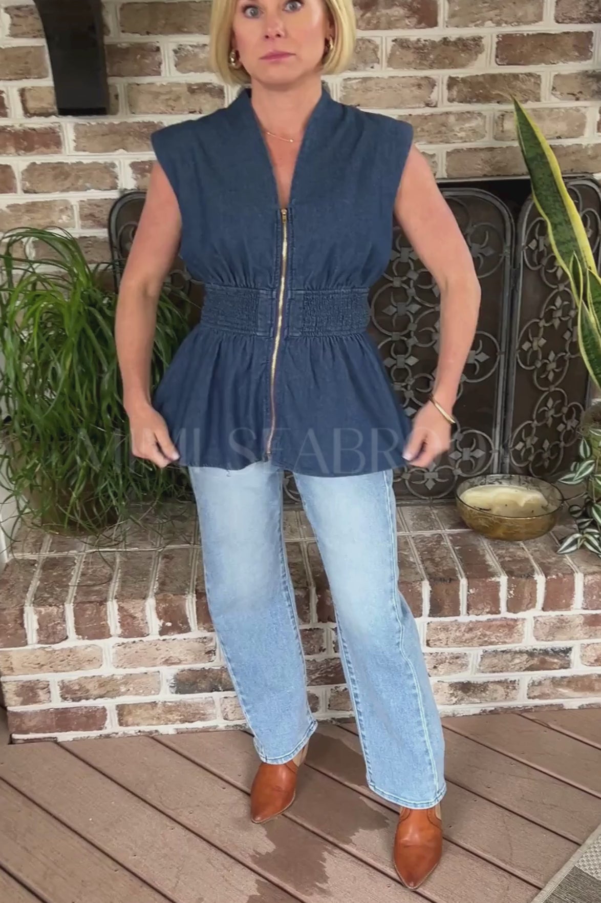The Alder top brings a fun twist to denim with its sleeveless design and flirty peplum flare. Made from breathable cotton, it features a wide smocked waist for a comfy, snug fit and a front zipper that adds a bit of edge. Perfect for playful days out or casual gatherings, this top combines style and comfort effortlessly.