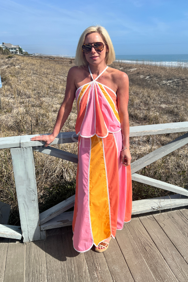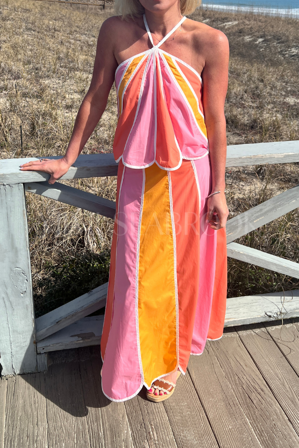 The Basile top is a color-block halter top featuring paneled detailing with scalloped edges. Designed with a flowy, relaxed silhouette and a gathered neckline. Pair with the Gantry skirt for a matching set.
