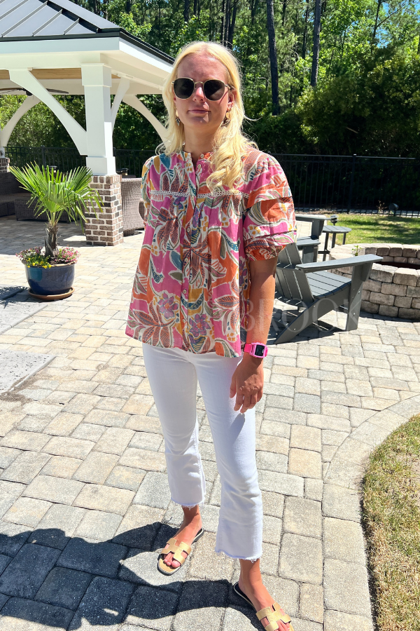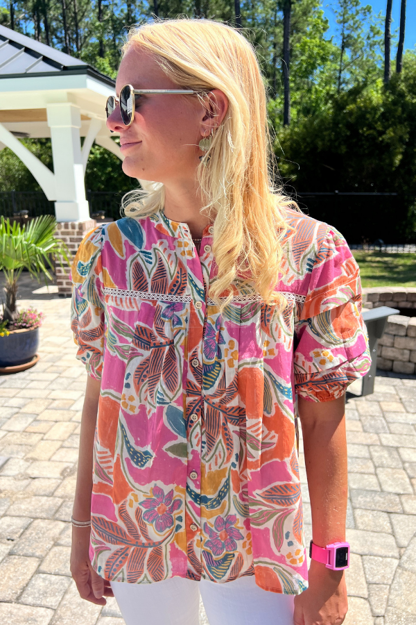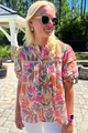 The Berlin top features a colorful abstract print, making it the perfect statement piece for any outfit. Embrace your unique style and stand out from the crowd with this vibrant top. Upgrade your wardrobe with this eye-catching design.
