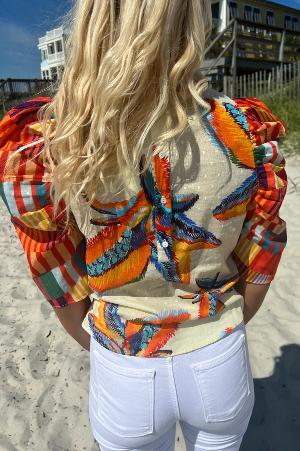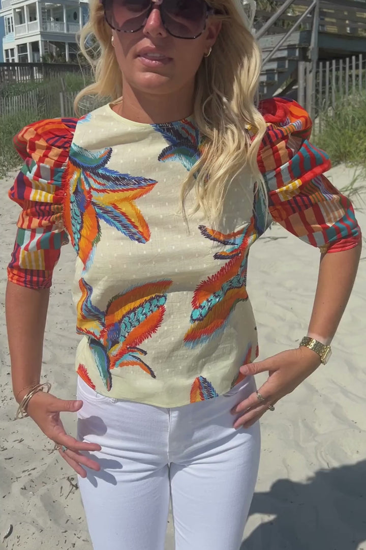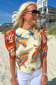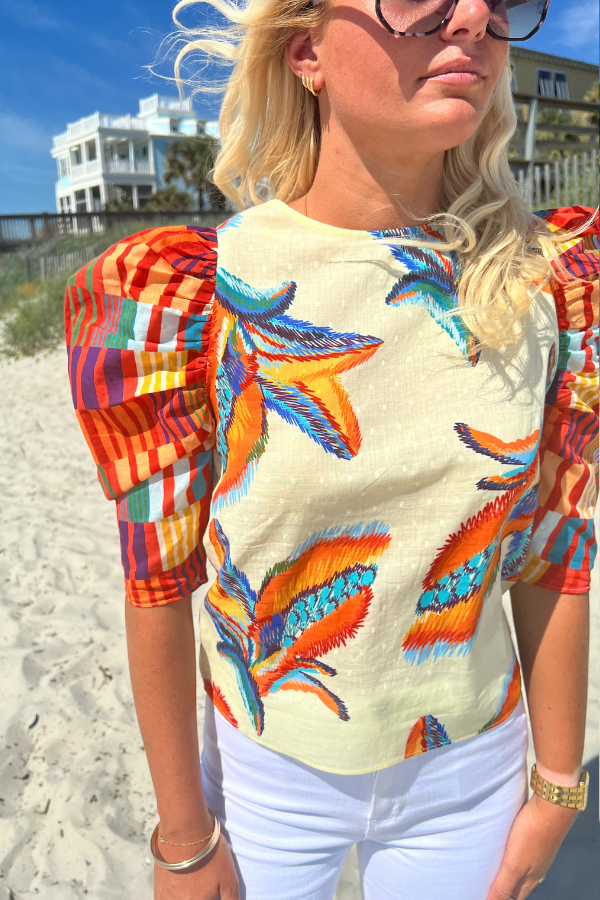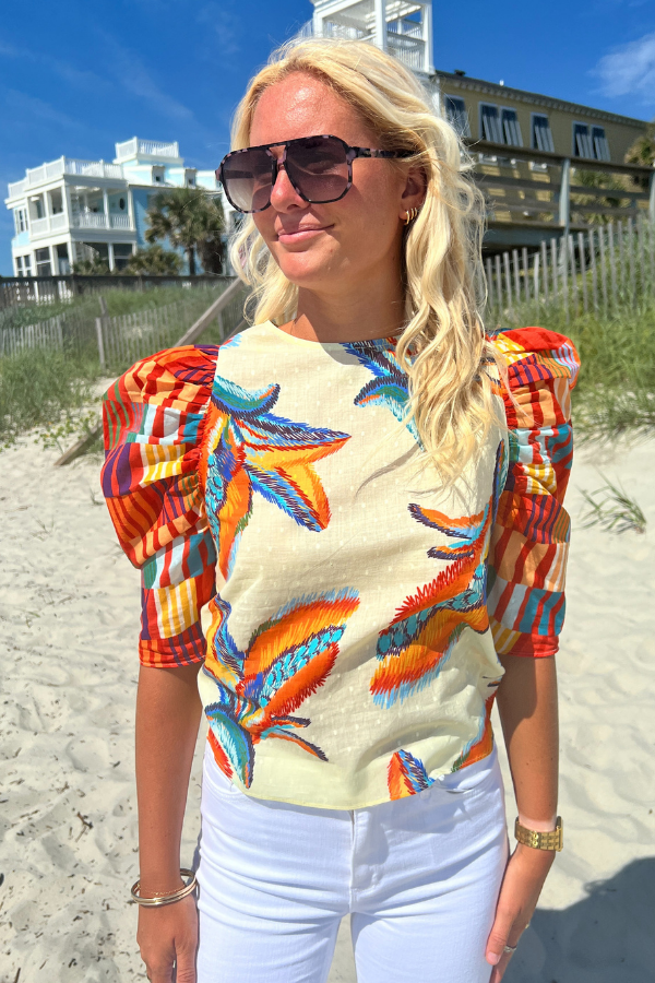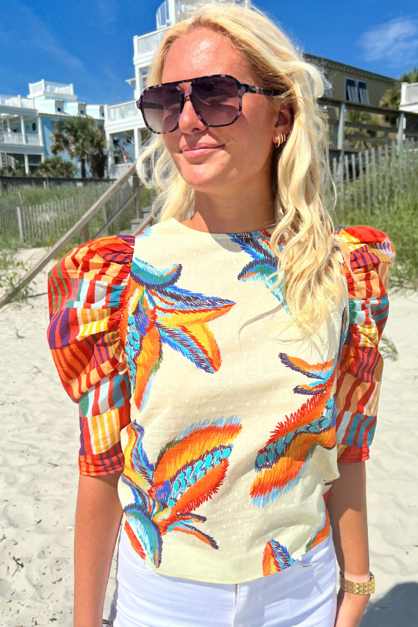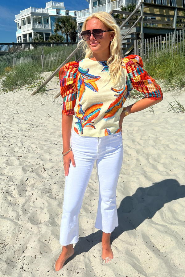The Charleston Top by King + Pitt is the perfect addition to your summer wardrobe. Featuring trendy puff sleeves and a vibrant tropical print, this top is sure to make a statement. Embrace the warm weather in style with this must-have piece.