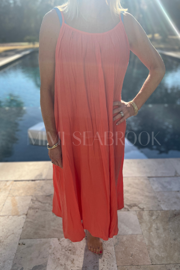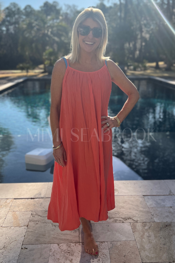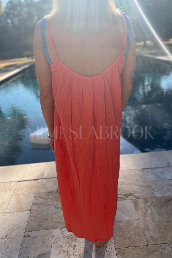 The Clearmont coverup is designed with an elasticized neckline and spaghetti straps for a secure fit. Its flowy silhouette and midi hem create a stylish and comfortable look. Perfect for a day at the beach or a summer soirée.