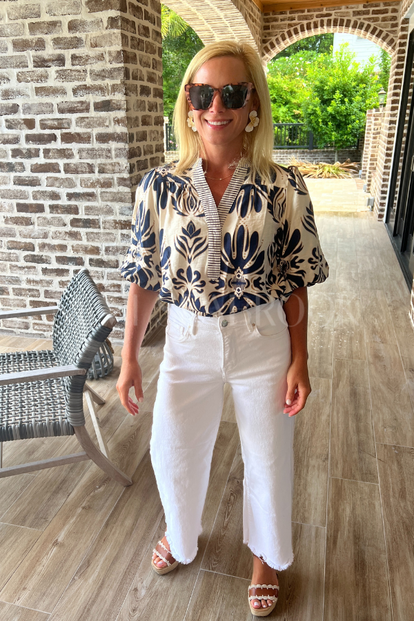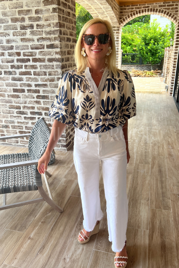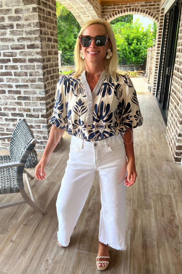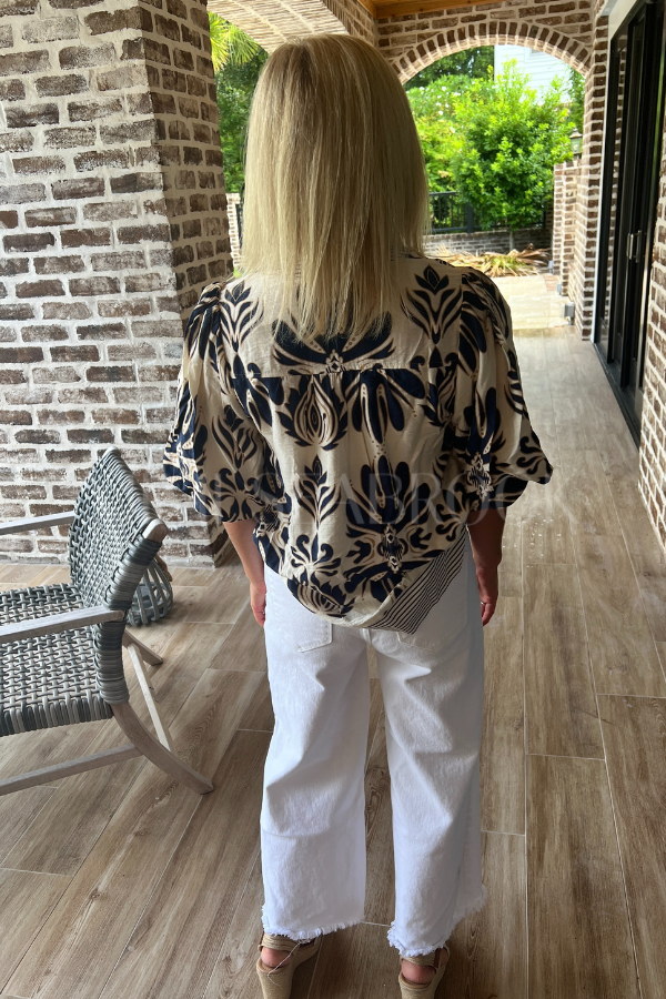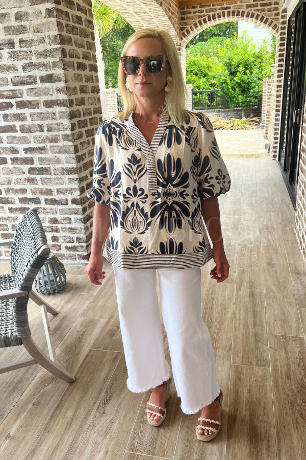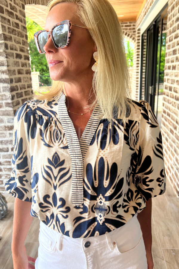The Dodson top in navy features a sophisticated blend of fabrics designed for comfort and style. Its bubble sleeves add a modern silhouette, crafted from a woven fabric combining rayon and nylon for softness and durability. The body incorporates a polyester-cotton-spandex mix, ensuring breathability with a slight stretch for ease of movement. Fully lined with polyester, this top offers a polished finish ideal for professional or refined casual wear.