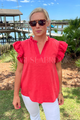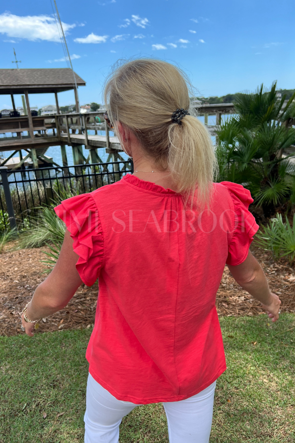 Introducing the Donahue top, a stylish addition to your wardrobe. Featuring a V neckline with stitch details, contrast band on the neck and sleeve ruffles, and ruffle short sleeves. Made from comfortable slub knit fabric for a perfect fit.