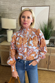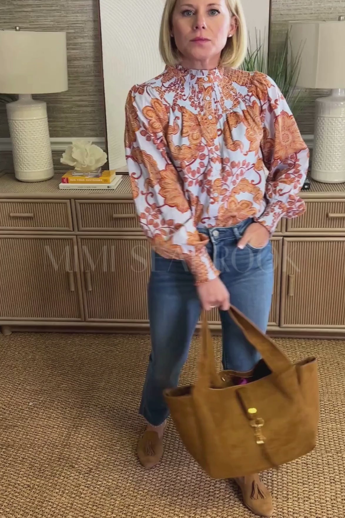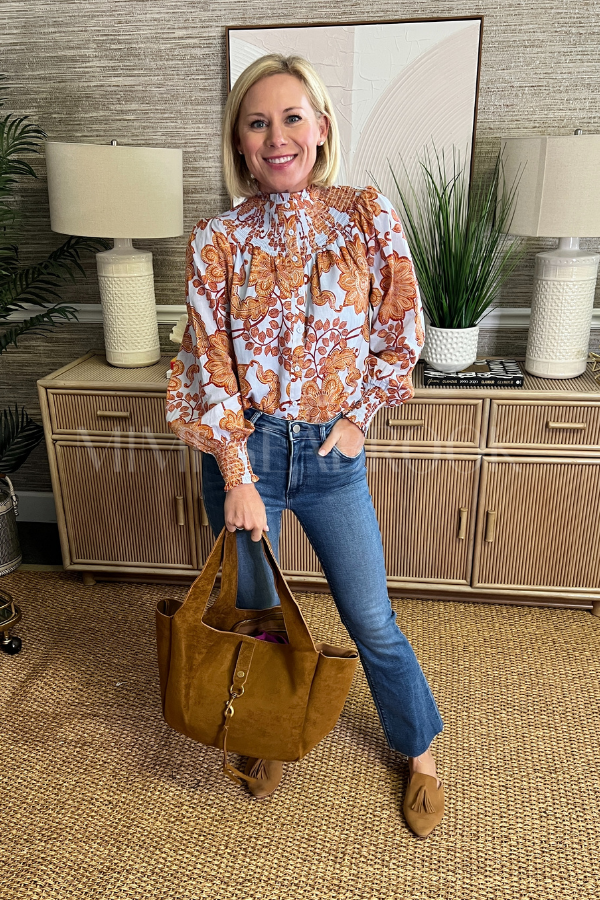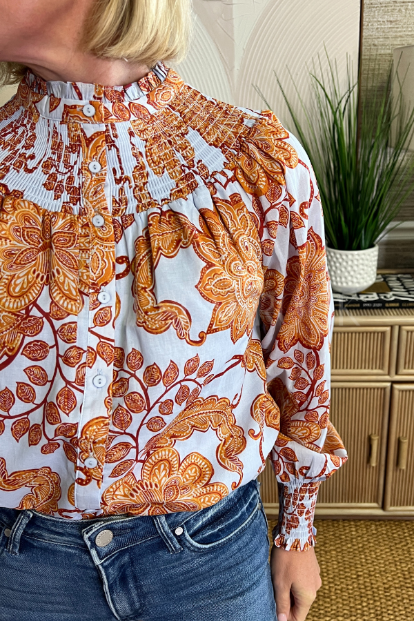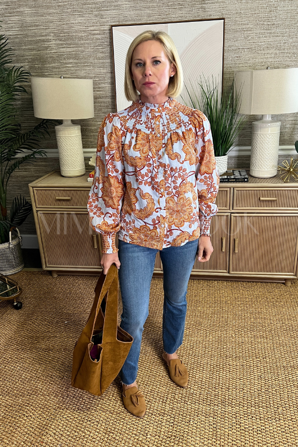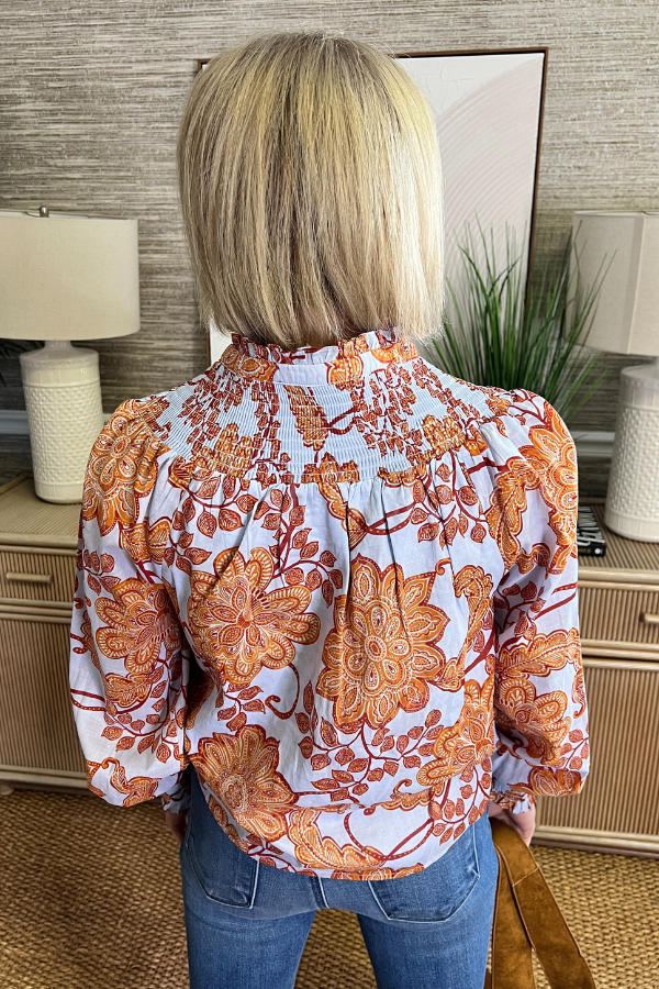 The Fairfax top is your new autumn favorite, bursting with seasonal charm. Featuring a smocked neck and sleeves, a sweet button-up front, and playful ruffle trim along the neckline, it’s designed to delight. The cozy long sleeves and vibrant floral motif bring the perfect touch of fall whimsy to any outfit.